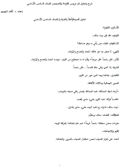 شرح وتحليل جميع دروس القراءة والنصوص في اللغة العربية للصف السادس الفصل الأول المكتبة الفلسطينية الشاملة