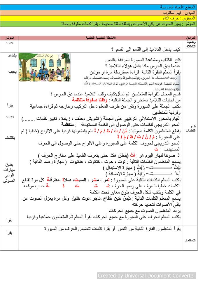 مذكرة القراءة والكتابة حرف التاء ت بتطبيق مهارات الوعي الصوتي الخطي السنة الثانية ابتدائي