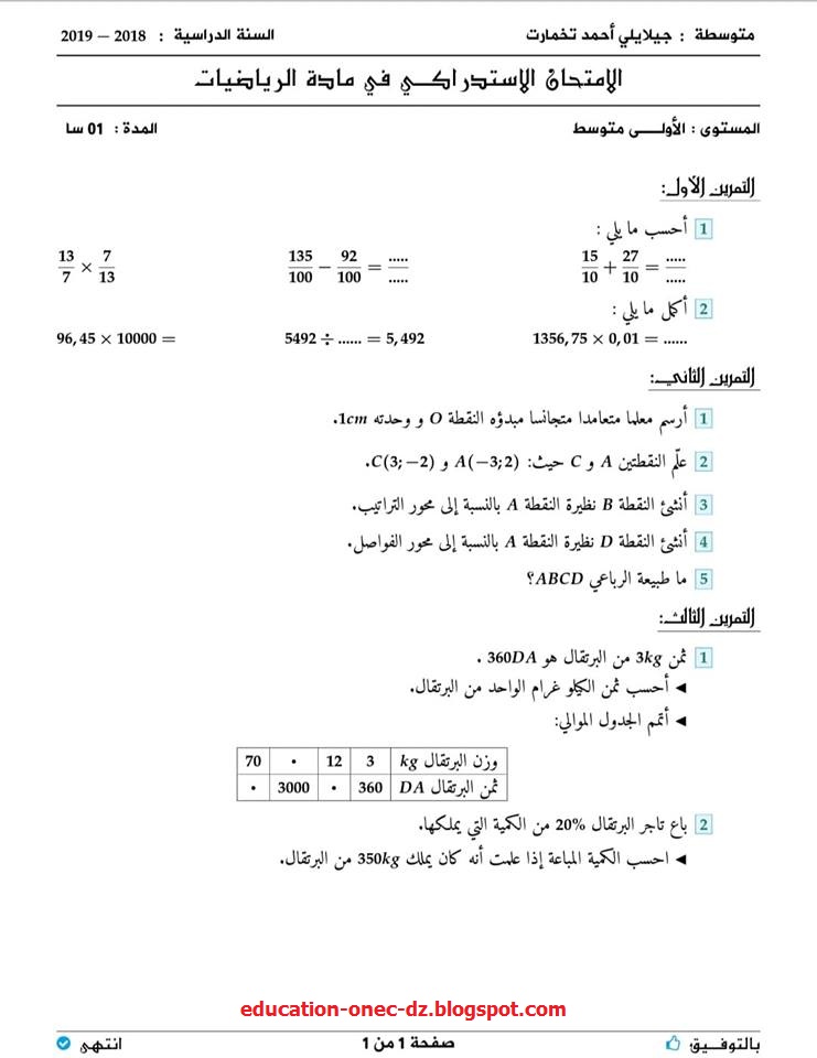 الموقع الاول للتعليم في الجزائر الاختبار الأول في مادة الرياضيات للسنة الأولى متوسط